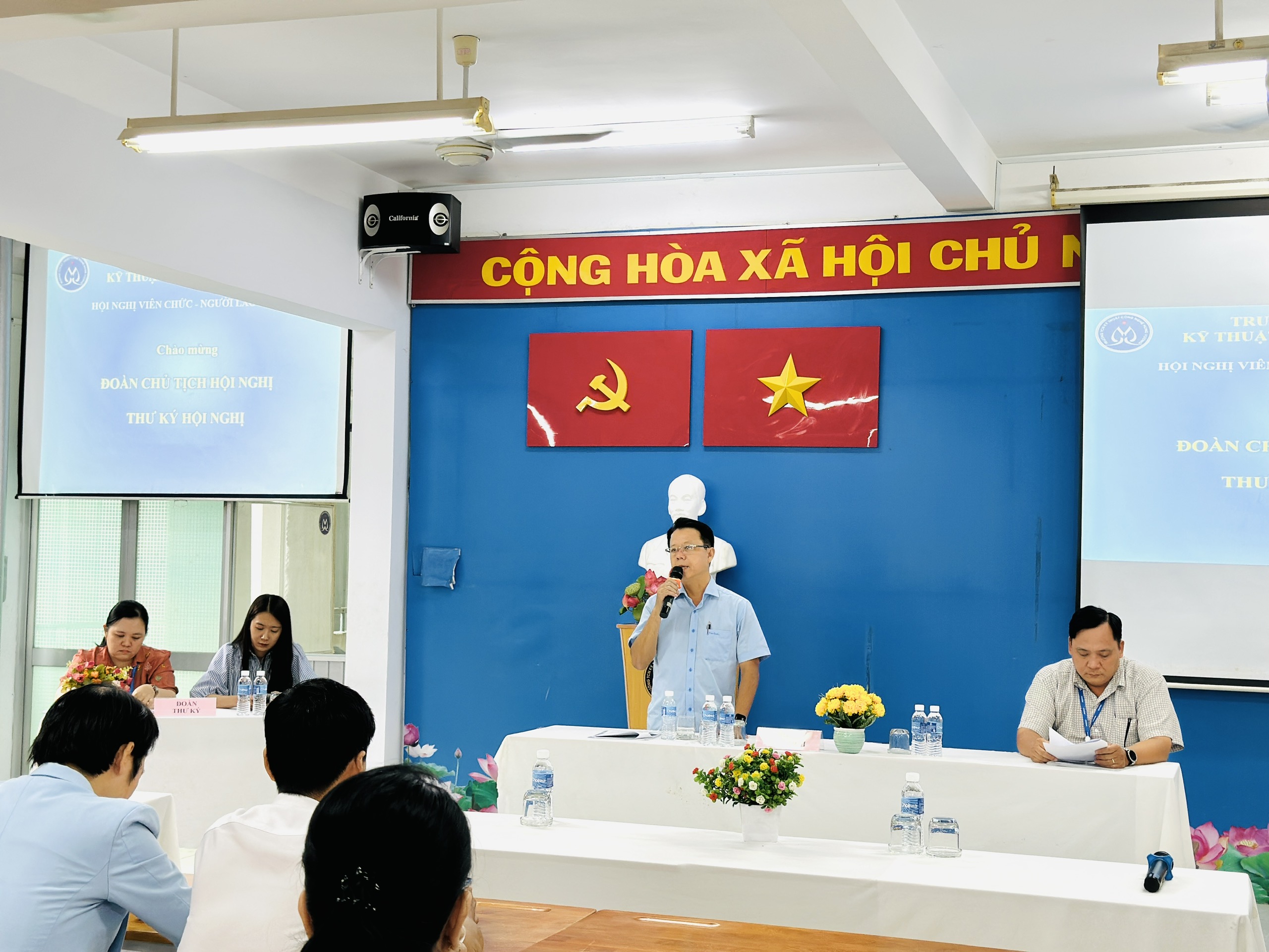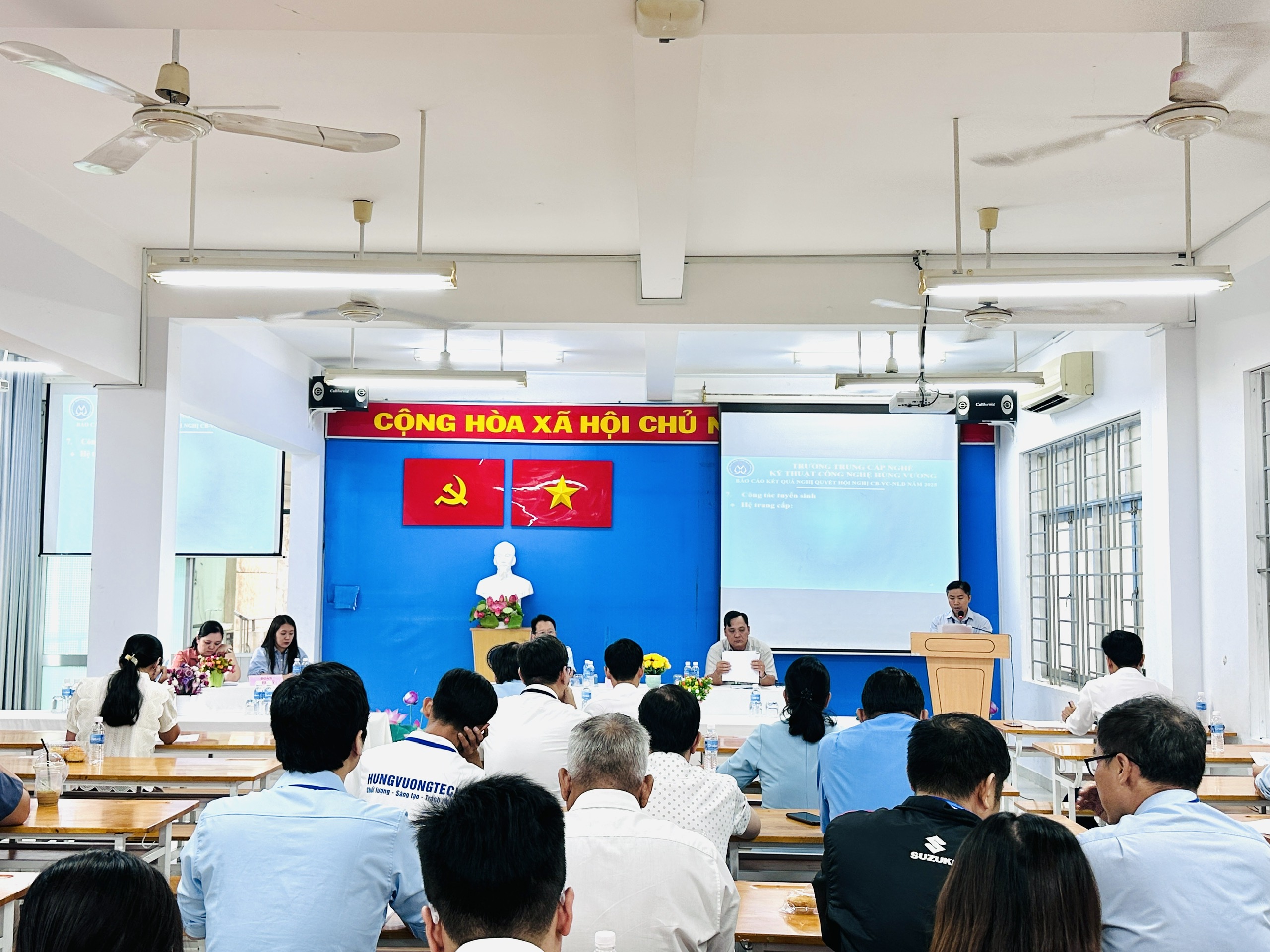 Mở đầu Hội nghị, Đồng chí Nguyễn Ngọc Hạnh – Bí thư chị bộ, Hiệu trưởng nhà trường chúc mừng đoàn thí sinh Nhà trường đã đạt được thành tích cao trong Kỳ thi tay nghề Thành phố năm 2026. Bên cạnh đó, Thầy cũng biểu dương những thành tích mà hội đồng sư phạm đã đạt trong năm học 2025 và chỉ ra những hạn chế còn tồn tại trong năm học qua.