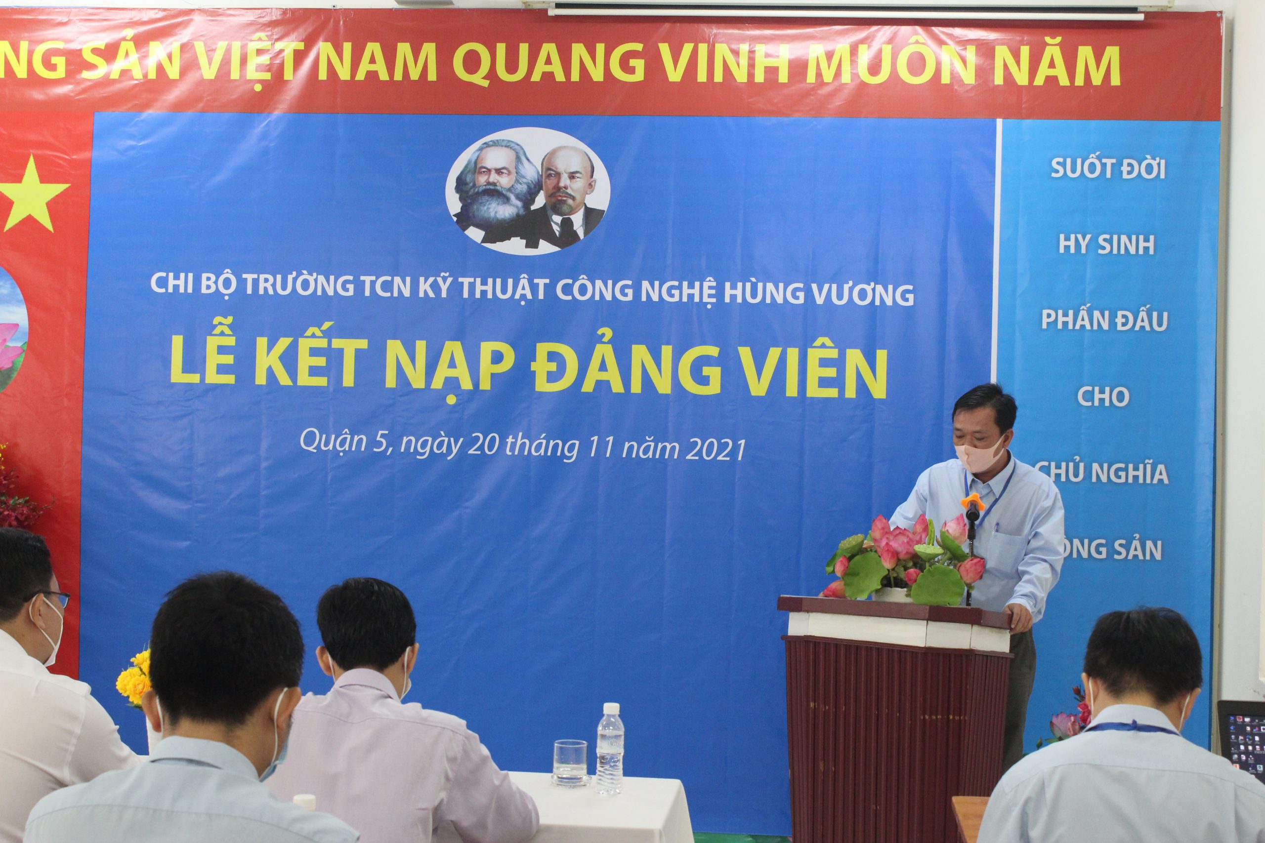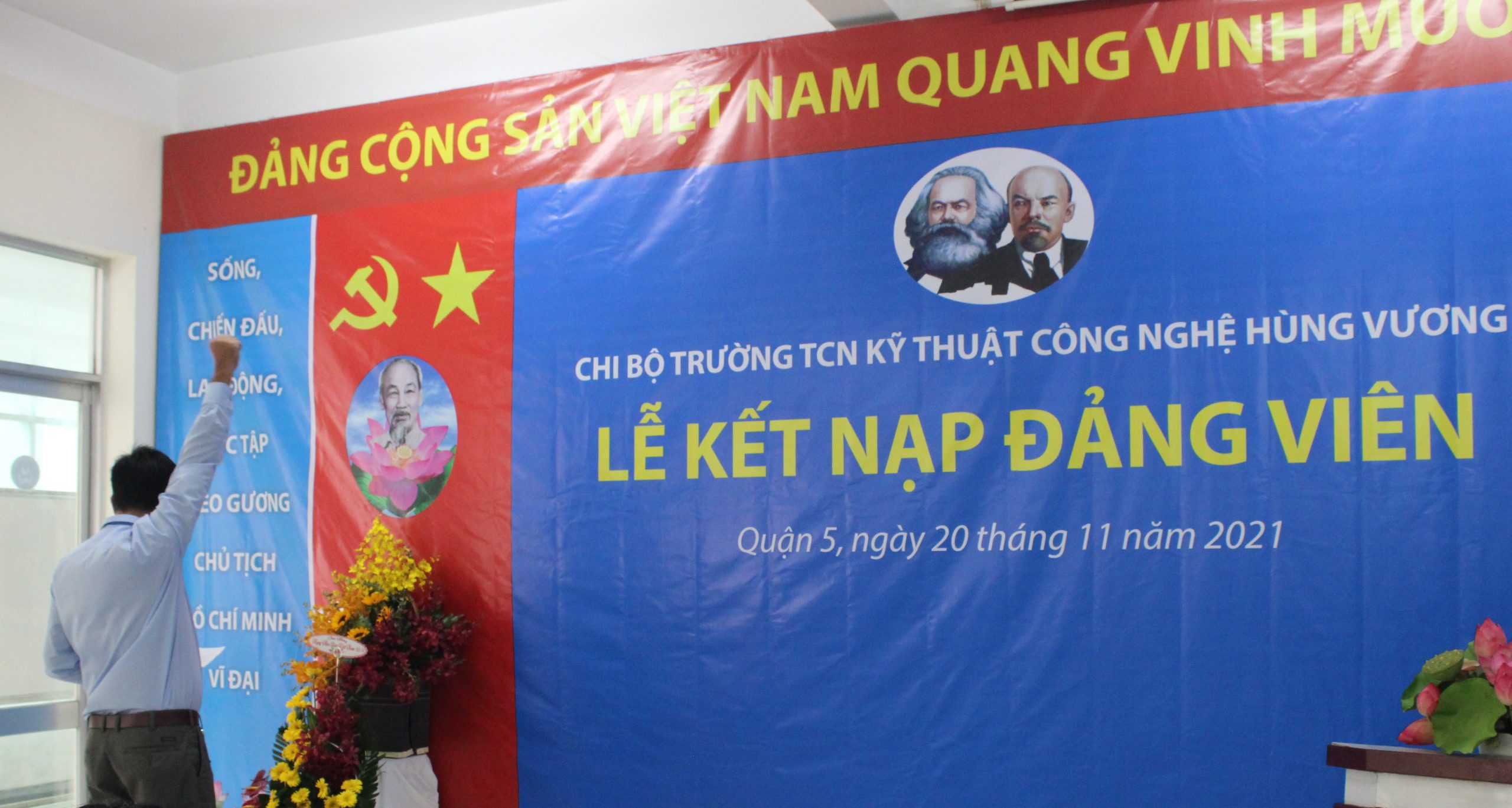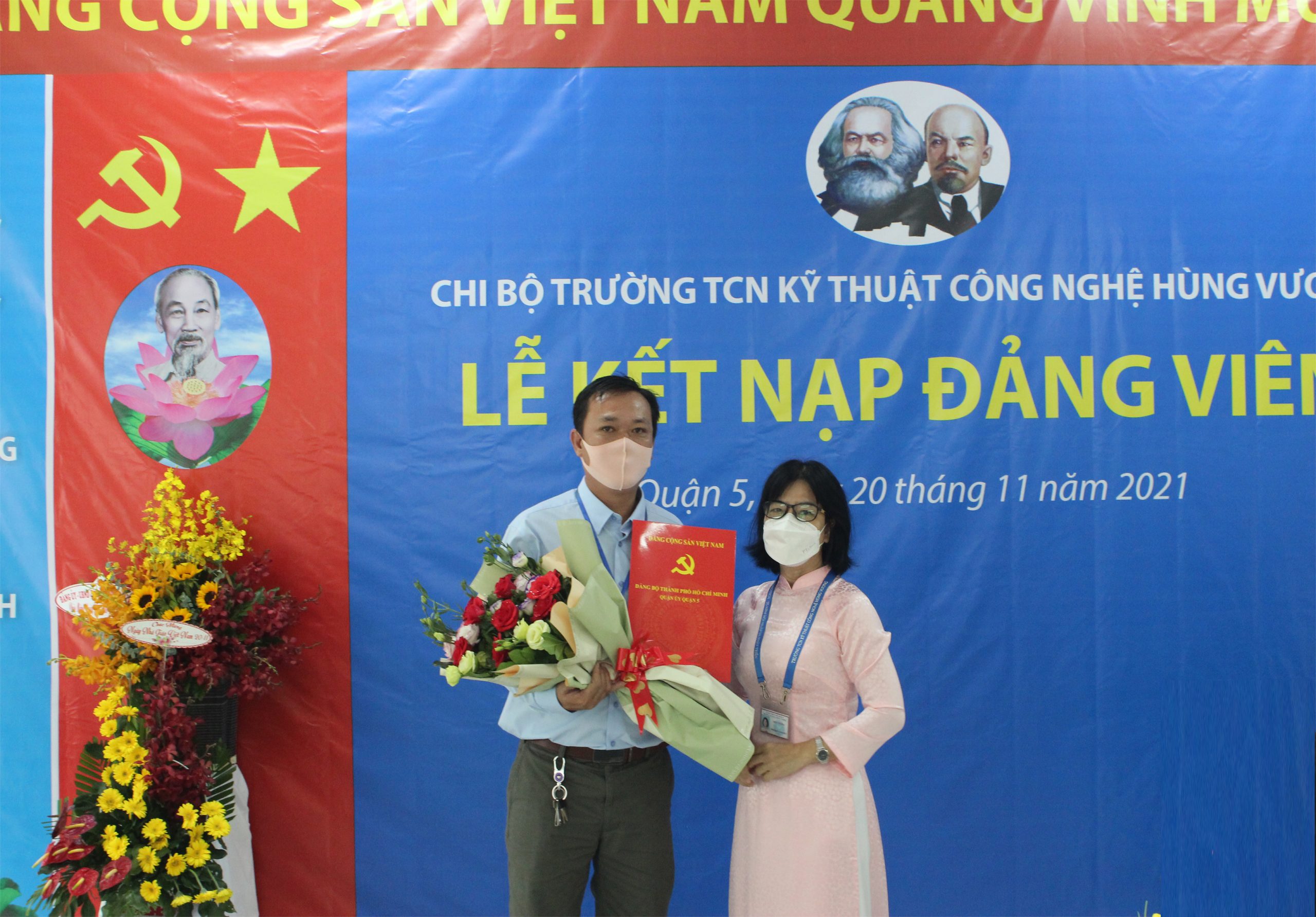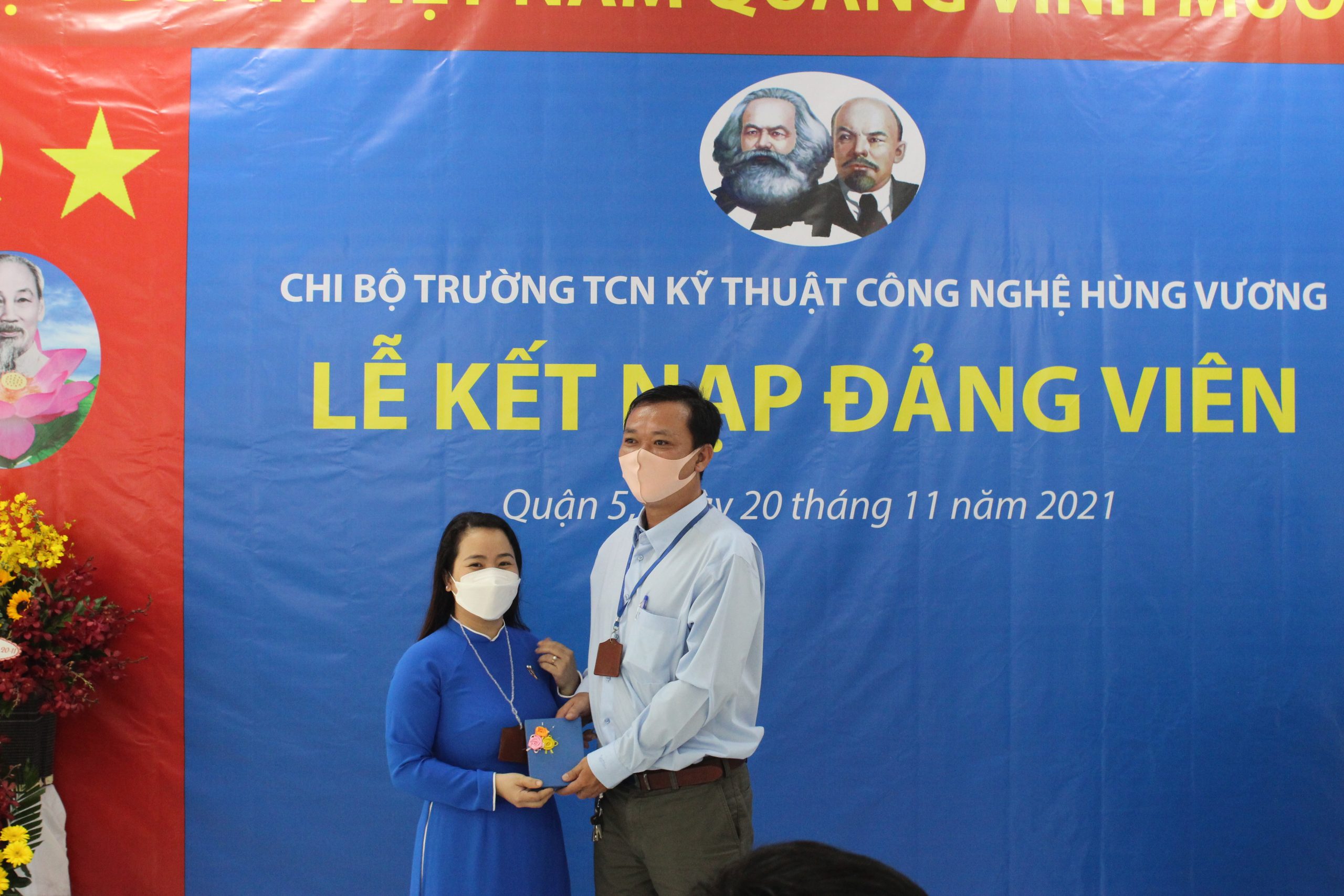 Căn cứ Điều lệ Đảng Cộng sản Việt Nam và Quy định số 45-QĐ/TW của BCH Trung Ương Đảng về thi hành Điều lệ Đảng quy định chi tiết một số điều, khoản trong Điều lệ Đảng. Thực hiện Quyết định số: 858-QĐ/ĐU ngày 12/11/2021 của Đảng bộ Quận 5 về chuẩn y kết nạp đảng viên. Nhân kỷ niệm Ngày Nhà Giáo Việt Nam 20/11/2021, được sự đồng ý của Thường vụ Quận ủy Quận 5, Chi bộ Trường Trung Cấp nghề Kỹ thuật Công nghệ Hùng Vương tổ chức Lễ kết nạp đảng viên cho quần chúng Nguyễn Anh Tú vào Đảng Cộng sản Việt Nam. Tham dự buổi Lễ gồm có: Về phía Đảng bộ Quận 5 có đồng chí Nguyễn Gia Long – Phó Ban dân vận Quận ủy Quận 5, đồng chí Phạm Tuấn Anh – Chuyên viên Ban Dân vận Quận Ủy. Về phía nhà trường có: đồng chí Phạm Quang Trang Thủy – Phó phí thư chi bộ, Hiệu trưởng nhà trường, cùng tất cả Đảng viên, Lãnh đạo Phòng, Khoa, Trung tâm, Bộ môn, Ban Chấp hành công đoàn, Ban Chấp hành đoàn thanh niên và các quần chúng đối tượng Đảng. Buổi lễ kết nạp Đảng viên được diễn ra trong không khí trang nghiêm, đúng trình tự, thủ tục của Điều lệ Đảng.