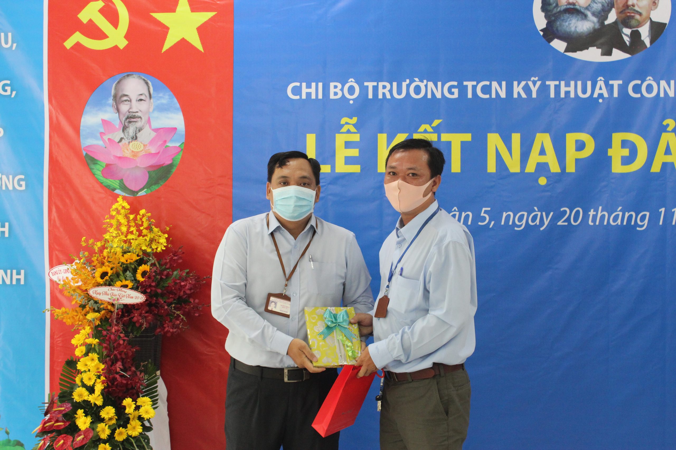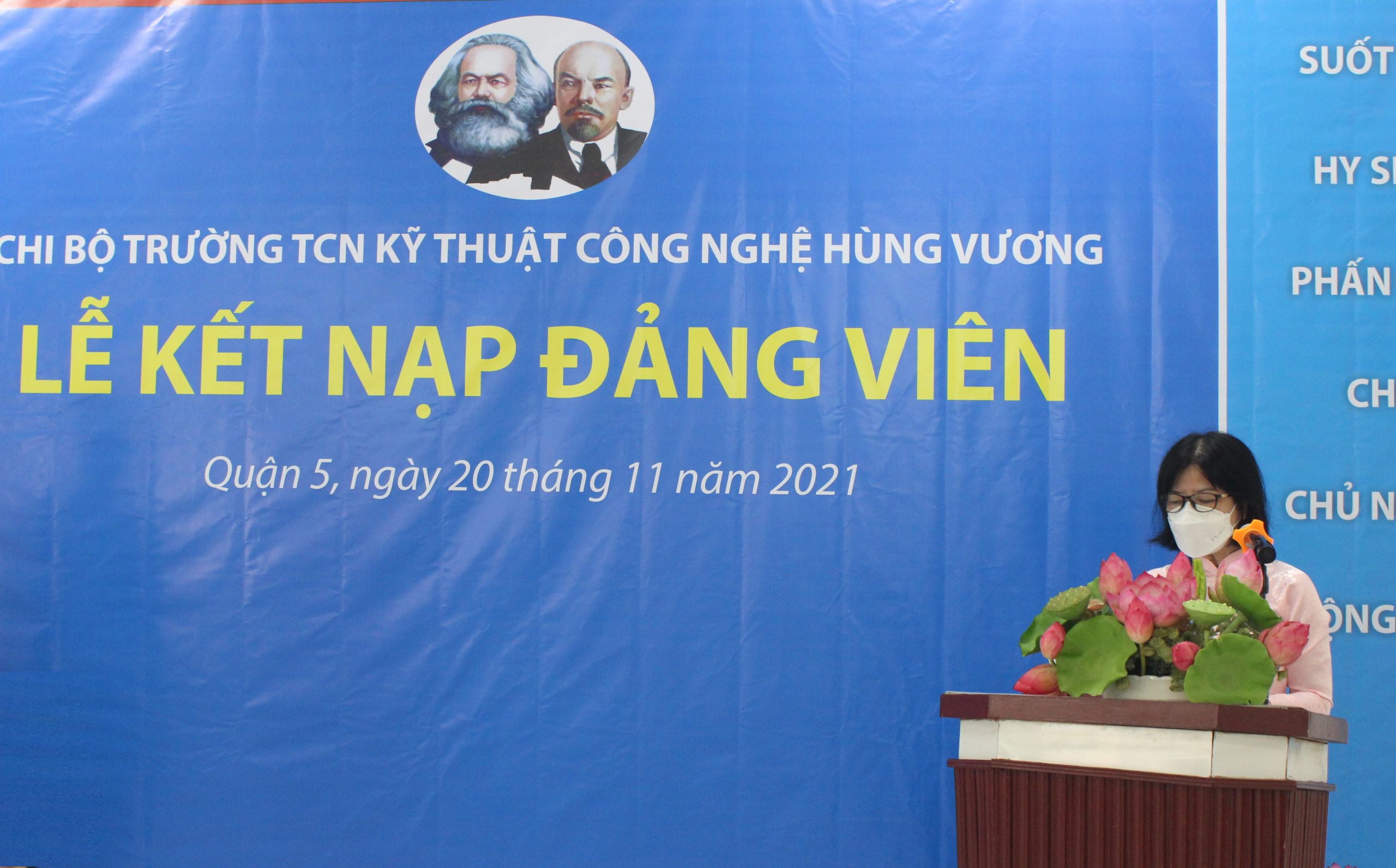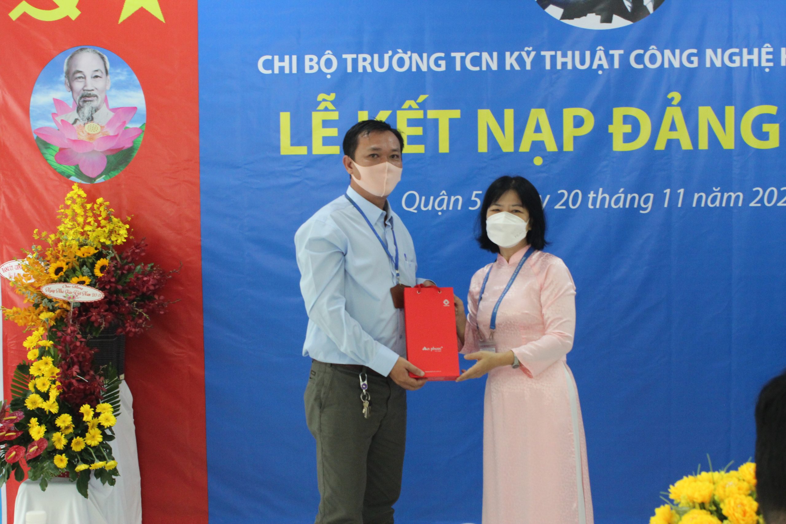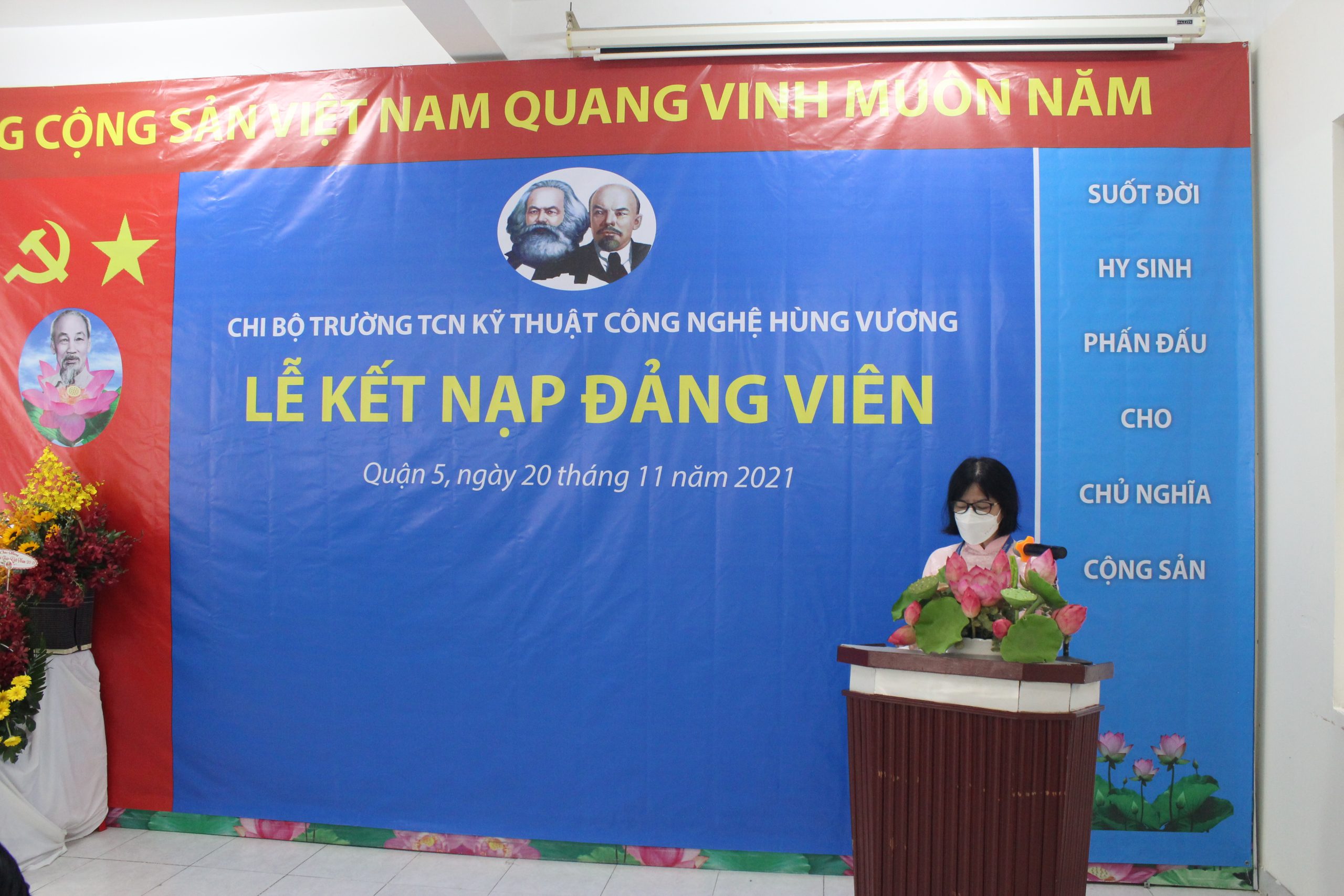 Căn cứ Điều lệ Đảng Cộng sản Việt Nam và Quy định số 45-QĐ/TW của BCH Trung Ương Đảng về thi hành Điều lệ Đảng quy định chi tiết một số điều, khoản trong Điều lệ Đảng. Thực hiện Quyết định số: 858-QĐ/ĐU ngày 12/11/2021 của Đảng bộ Quận 5 về chuẩn y kết nạp đảng viên. Nhân kỷ niệm Ngày Nhà Giáo Việt Nam 20/11/2021, được sự đồng ý của Thường vụ Quận ủy Quận 5, Chi bộ Trường Trung Cấp nghề Kỹ thuật Công nghệ Hùng Vương tổ chức Lễ kết nạp đảng viên cho quần chúng Nguyễn Anh Tú vào Đảng Cộng sản Việt Nam. Tham dự buổi Lễ gồm có: Về phía Đảng bộ Quận 5 có đồng chí Nguyễn Gia Long – Phó Ban dân vận Quận ủy Quận 5, đồng chí Phạm Tuấn Anh – Chuyên viên Ban Dân vận Quận Ủy. Về phía nhà trường có: đồng chí Phạm Quang Trang Thủy – Phó phí thư chi bộ, Hiệu trưởng nhà trường, cùng tất cả Đảng viên, Lãnh đạo Phòng, Khoa, Trung tâm, Bộ môn, Ban Chấp hành công đoàn, Ban Chấp hành đoàn thanh niên và các quần chúng đối tượng Đảng. Buổi lễ kết nạp Đảng viên được diễn ra trong không khí trang nghiêm, đúng trình tự, thủ tục của Điều lệ Đảng.