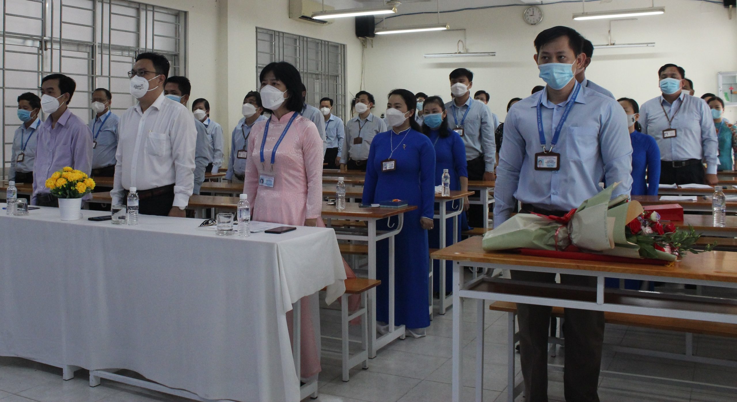 Đảng viên mới chụp ảnh lưu niệm cùng Quận Ủy, Ban Giám hiệu và đảng viên chi bộ Nhà trường: