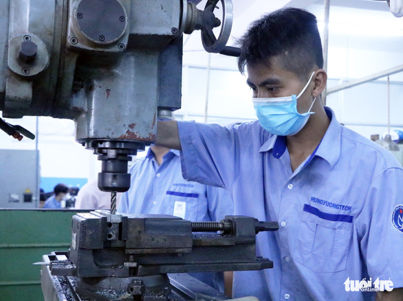 Học viên thực hành nghề cơ khí tại Trường trung cấp nghề Kỹ thuật Hùng Vương chiều 20-12 – Ảnh: TRỌNG NHÂN
