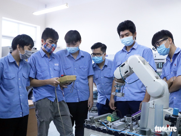 Các sinh viên thực hành trên mô hình nghề kỹ thuật robot chiều 20-12 – Ảnh: TRỌNG NHÂN